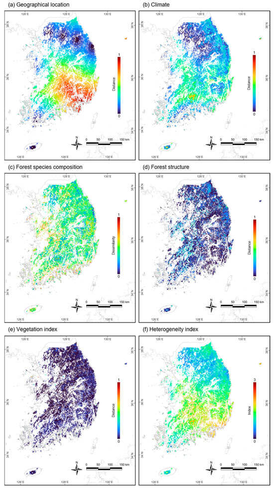 The heterogeneity index for forests in South Korea, calculated as the sum of distances and dissimilarities for each factor, was 1.21 ± 0.37 (Figure 6f). The grid with the highest heterogeneity index was located at 35°33′15.01″N, 127°44′15″E, with a value of 2.97.