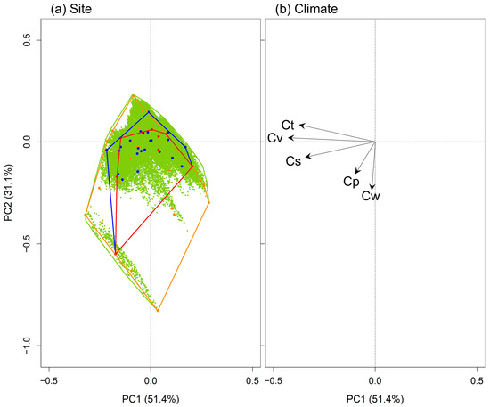 Biplot of principal component analysis of climate variables in forests of South Korea: (a) site (red dots: current group, orange dots: optimization group, blue dots: Automatic Mountain Meteorology Observation System group, green dots: forests in South Korea, polygons for each color are drawn by convex hull algorithm); and (b) Climate (Ct: average temperature, Cp: Precipitation, Cs: Solar radiation, Cw: Wind speed, Cv: Water vapor pressure).