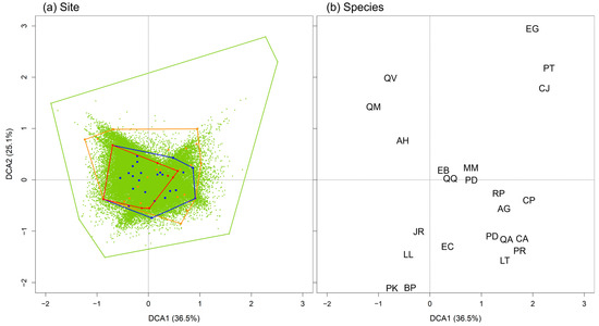 Biplot of detrended correspondence analysis of area proportion of forest tree species in the forests of South Korea: (a) site (red dots: current group, orange dots: optimization group, blue dots: Automatic Mountain Meteorology Observation System group, green dots: forests of South Korea, polygons for each color were drawn by convex hull algorithm); and (b) Among the 32 taxa, only 16 taxa with a dominant frequency of 0.1% or more in the entire grid were indicated in the biplot (PD: Pinus densiflora, QQ: Quercus sp. forest, EB: broad-leaf forest, MM: mixed forest, QM: Quercus mongolica, LL: Larix kaempferi, PT: Pinus thunbergii, QV: Quercus variabilis, PK: Pinus koraiensis, PR: Pinus rigida, QA: Quercus acutissima, CP: Chamaecyparis obtusa, CA: Castanea crenata, LT: Liriodendron tulipifera, BP: Betula pendula, EG: evergreen forest).