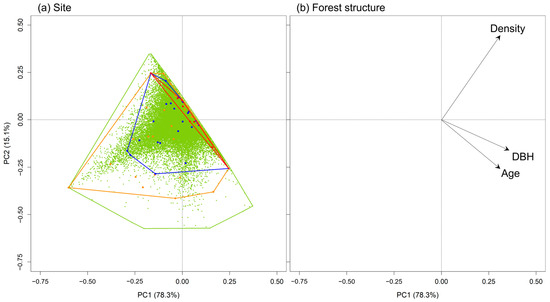 Biplot of principal component analysis of forest structure in forests of South Korea. Categorical forest structure data were calculated as community-weighted means and converted to continuous data: (a) site (red dots: current group, orange dots: optimization group, blue dots: Automatic Mountain Meteorology Observation System group, green dots: forests in South Korea; polygons for each color were drawn with the convex hull algorithm); and (b) forest structure.