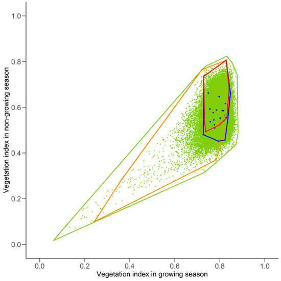 Biplot of vegetation index in the growing season and non-growing season in forests in South Korea. The vegetation index was calculated by the normalized difference vegetation index. The red dots are the current group, the orange dots are the optimization group, the blue dots are the Automatic Mountain Meteorology Observation System group, and the green dots are the forests in South Korea; the polygons for each color were drawn with the convex hull algorithm.
