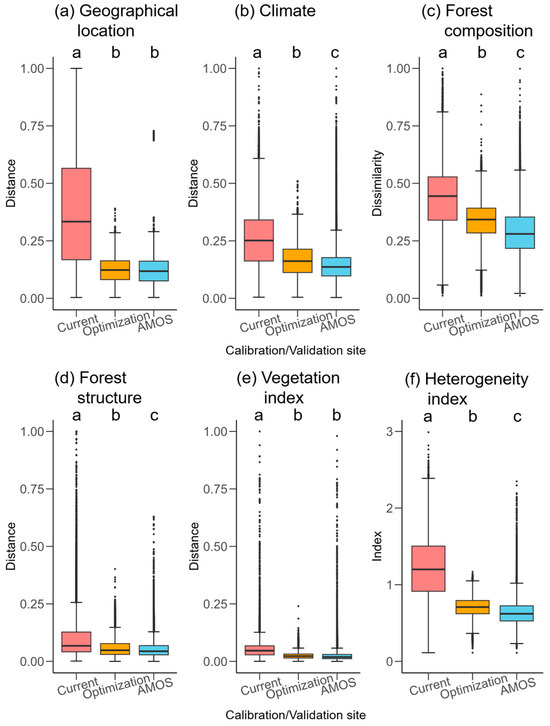 Heterogeneity index in forests in South Korea according to three groups of calibration/validation sites. Box subscripts are determined by analysis of variance and Tukey’s honestly significant difference test for post hoc analysis.