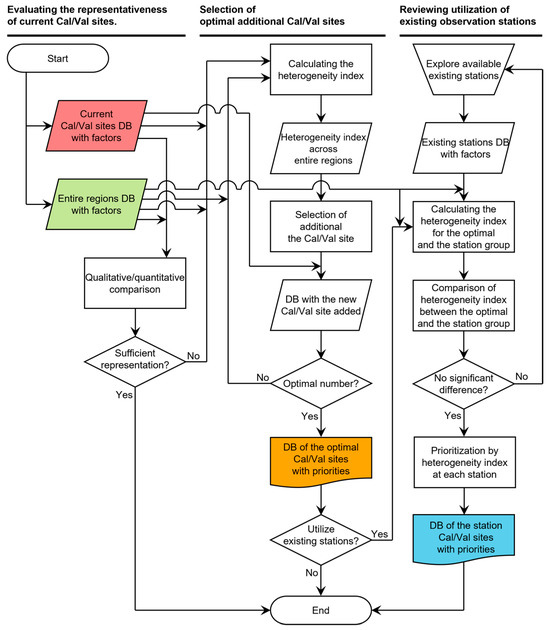 Therefore, the Cal/Val site installation planning framework needs to consider the following factors: (1) The representativeness of existing Cal/Val sites should be evaluated in a multifaceted/multivariate manner, and other factors should be easily added; (2) The location and number of new optimal Cal/Val sites should be explored, including existing Cal/Val sites; (3) It should be possible to evaluate the utility of other ground stations as new Cal/Val sites; and (4) It should determine the installation priority of Cal/Val sites.