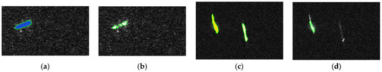 The ship segmentation result of the SSDD dataset: (a) Ground truth of PSeg No. 421. (b) Segmentation result. (c) Ground-truth of PSeg No. 328. (d) Segmentation result.