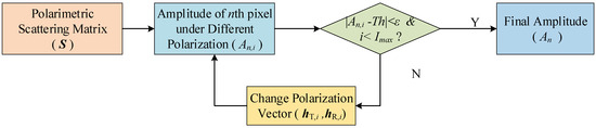 In other words, the polarization response of the target is the inner product of the target scattering matrix element vector and the transmitting–receiving polarization element vector. From (2) and (6), it can be seen that the target’s amplitude response can be changed by transmitting–receiving polarization modulation. Conventional SAR images are single-polarization with a determined relative magnitude relationship between the pixels. While, for PolSAR images, the amplitude of each pixel and the relationship among pixels vary as the transmitting–receiving polarization changes. The employment of polarization information offers the potential to modulate the amplitude relationship of pixels within the SAR image.