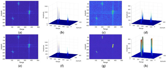 The Gaofen-3 ship chips and polarization modulation results for a single target: (a) 2D image of HH. (b) 3D image of HH. (c) 2D image of optimization on the target area. (d) 3D image of optimization on the target area. (e) 2D image of joint optimization. (f) 3D image of joint optimization. (g) 2D image of amplitude approximation. (h) 3D image of amplitude approximation.