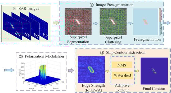 This Section introduces a ship segmentation method from polarimetric SAR images, utilizing polarization modulation. The proposed method is divided into three steps: image pre-segmentation, optimization of polarization modulation, and extraction of the ship’s contour. Initially, the image is partitioned into the foreground (target) and background (clutter) using a super-pixel unsupervised clustering approach. Subsequently, based on the preliminary division results, the target amplitude is optimized through the application of polarization modulation. Finally, the ship’s contour is extracted from the optimized image using an edge-detection operator and an adaptive edge extraction algorithm. The flowchart of this algorithm is depicted in Figure 5. The following will provide a detailed description of each part of the algorithm.