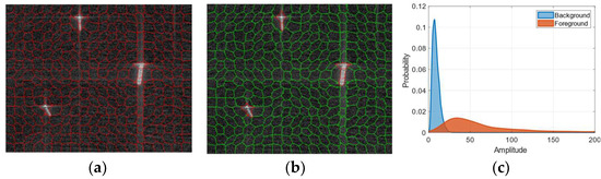 Superpixel segmentation results and Superpixel-based foreground–background classification results: (a) Superpixel segmentation results; (b) Superpixel-based foreground–background classification results; (c) Amplitude distribution of foreground and background superpixels.