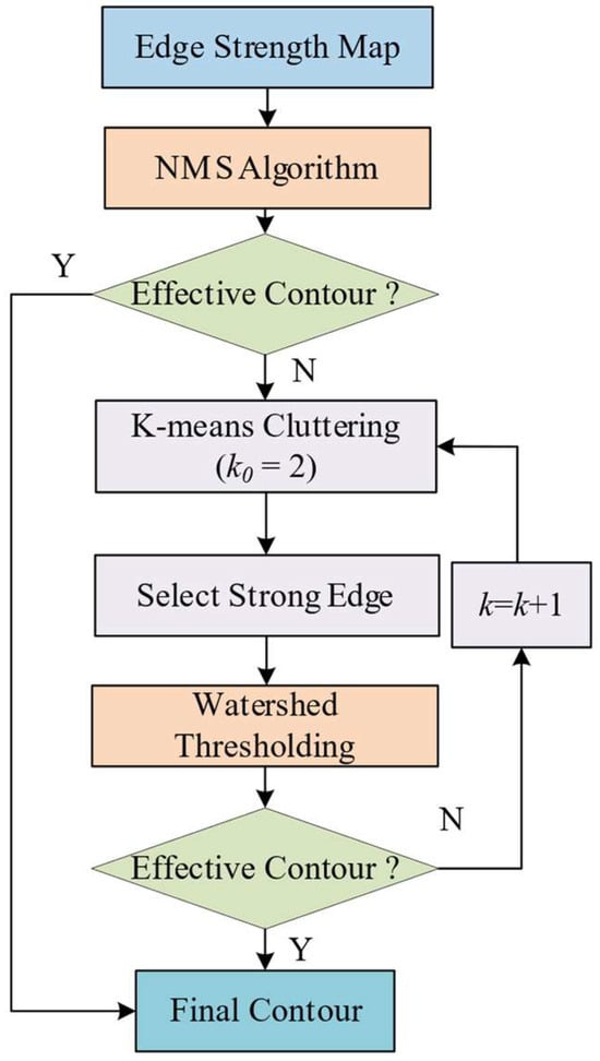 The NMS method is firstly adopted to find the closed boundary. Nevertheless, in most cases, the NMS algorithm finds it difficult to find the closed boundary. Therefore, the watershed algorithm is subsequently integrated with adaptive clustering to derive the refined contour. The edge-strength map is segmented into two classes according to the k-means algorithm and the class with stronger edge strength is treated as the target edge. The extracted contour is evaluated against two criteria: it must constitute a closed, complete contour and the coverage area of the closed contour makes up a major part of the strong edge region. If these conditions are met, the edge is called the effective contour. Otherwise, further segmentation is conducted with more clustering numbers. To prevent excessive division, a maximum class number limit is set.