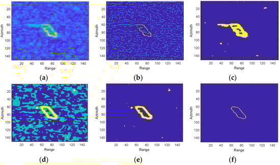 As depicted in Figure 10a, there is a discontinuity between the strong edges in the edge-strength map. The contours obtained by NMS have breaks and internal sticking, which leads to a failure to extract closed contours. Moreover, because of the high intensity and unevenness of the background edges, there are more false alarms in the clustering results obtained when the number of clusters is set to two. Meanwhile, there is more interference in the target area, which is not favorable for edge detection. When the number of clustering categories increases to three, the target and background regions are effectively distinguished. By analyzing the edge intensity of each class, the potential region of the target contour is obtained with the largest intensity, as shown in Figure 10e. The watershed algorithm is applied to the strong edges, and the final complete target contour is extracted as shown in Figure 10f.
