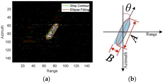 where . is the transformation matrix of the equation constraints. The above optimization problem of equality constraint can be solved with the Lagrange multiplier method. The result of ellipse fitting is shown in Figure 11a, where the green curve represents the detected ship contour, and the red curve is the result of target ellipse fitting. According to the ellipse equation, the major axis , the minor axis , and the orientation angle of the ellipse can be calculated, where the ellipse orientation is the angle between the major axis of the ellipse and the vertical line. Due to the fact that the front and back of ships cannot be discriminated, the orientation angle is manually corrected to the range of 0° and 90°. The parameters of the ellipse are shown in Figure 11b.