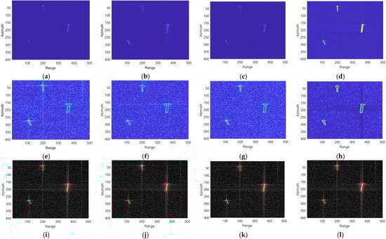 Contour extraction results of multi-target PolSAR images: (a–d) are the intensity of HH, HV, VV, and polarization modulation image, respectively. (e–h) are the edge-strength map of HH, HV, VV, and polarization modulation, respectively. (i–l) are the contour results of HH, HV, VV, and polarization modulation, respectively.