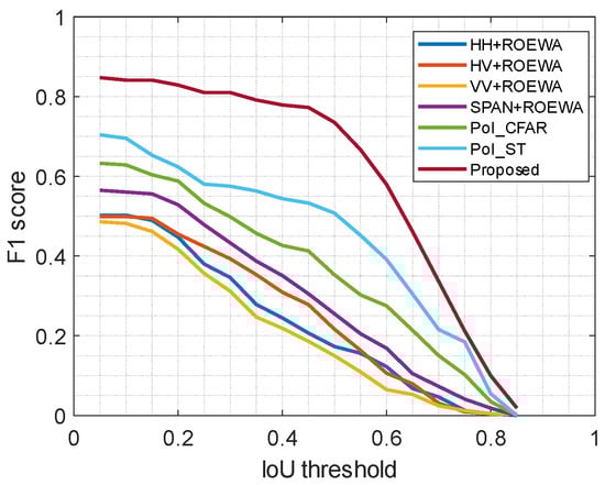 By setting different IoU thresholds, the detection performance of different methods can be obtained, as illustrated in Figure 15. The results indicate that the cross-polarized channels have the best performance among the single-polarization images. Furthermore, the performance of the total power obtained by the fusion of polarization channels is better than that of single-polarization channels, but the enhancement is not significant. In terms of the optimized image after polarization modulation, there is a significant improvement in the F1-scores of the detection results, outperforming other methods.