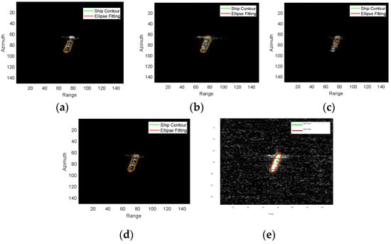The results of ship contour and ellipse fitting with different images: (a–e) are the fitting results of HH, HV, VV, SPAN, and polarization modulation images, respectively.