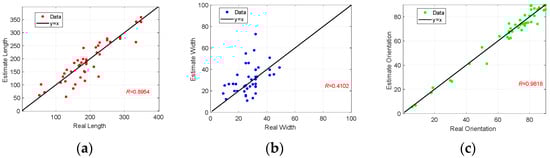 Ship size extraction results: (a–c) are the extraction results of length, width, and orientation, respectively.