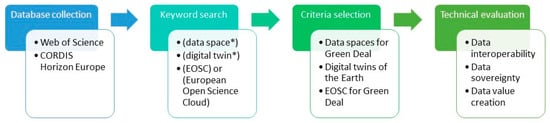 To date, there have been several review articles on DTs in the environmental sector focusing on agriculture [13,14,15,16,17,18,19,20,21,22,23,24] and Earth systems [25,26,27,28,29,30,31]. A few of them are also related to an emerging Green Deal Data Space (GDDS) [29,31]. However, so far, no review includes the EOSC as a mechanism to connect research data to the GDDS or to DTs. Considering the implementation of the GDDS is an overarching topic between two different EU funding programmes, DIGITAL and HORIZON, this article focused on reviewing the data and digital infrastructures relevant to the European Green Deal initiatives to address research gaps that exist between European Common Data Spaces (including the EOSC) and DTs, following the state of the art described in Section 2.