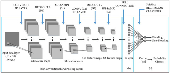 Topological architecture of the 2D feedforward CNN. (a) represents the feature extraction phase; (b) represents the extracted features; (c) is the food and non-food classification processes of an output [50].