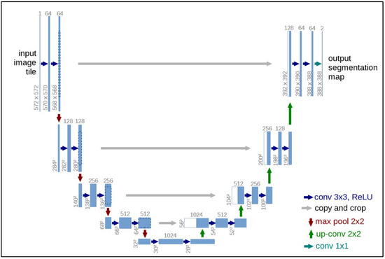 - Ronneberger, O.; Fischer, P.; Brox, T. U-Net: Convolutional Networks for Biomedical Image Segmentation. In Medical Image Computing and Computer-Assisted Intervention—MICCAI 2015; Navab, N., Hornegger, J., Wells, W.M., Frangi, A.F., Eds.; Lecture Notes in Computer Science; Springer International Publishing: Cham, Switzerland, 2015; Volume 9351, pp. 234–241. ISBN 978-3-319-24573-7. [Google Scholar]