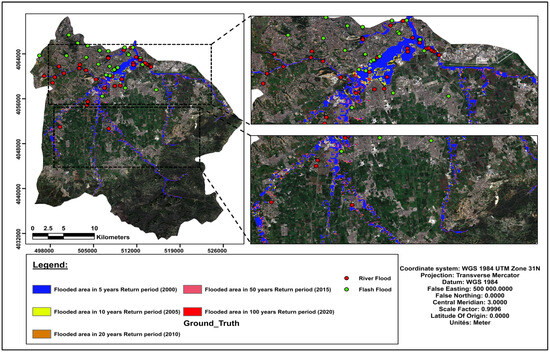 In an era marked by the escalating impacts of climate change, flooding has emerged as one of the most devastating and deadly natural hazards and a significant and recurring threat to communities worldwide. The devastating consequences of floods, ranging from loss of life and property damage to disruption of essential services and displacement of populations [1,2,3], underscore the urgent need for robust flood-detection methods. As climate change intensifies, the frequency and severity of extreme weather events, including storms and heavy rainfall, are expected to increase, amplifying the risk of flooding in vulnerable regions.