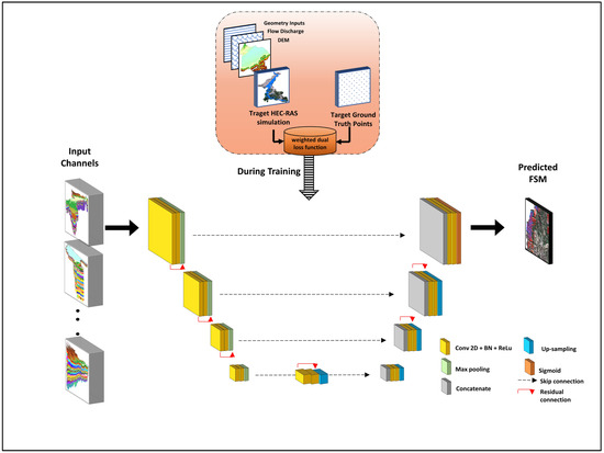Additionally, employing the “Sigmoid Focal Loss” function in training the W–Res–U–Net model increased its sensitivity by 0.27% and AUC by 0.17% compared to HEC–RAS simulations. To enhance realism, our model incorporated a dual-loss function that accounted for physical simulations by HEC-RAS and ground truth data. This hybridization resulted in the W–Res–U–Net model achieving a sensitivity of 71.16%, specificity of 91.14%, and AUC of 92.95% when validated against physical simulations, and a sensitivity of 88.89%, specificity of 93.07%, and AUC of 95.87% when validated against ground truth points.