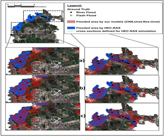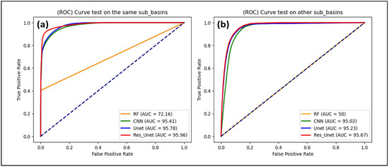 Our study involved training the model on eight sub-basins and testing on five others. The Res–UNet model, when trained over several years, demonstrated superior performance with sensitivity rates of 67.36% and 95.67% AUC, outperforming HEC–RAS simulations. Conversely, the machine-learning model (RF) could not be generalized across other test sub-basins, highlighting its limitations.