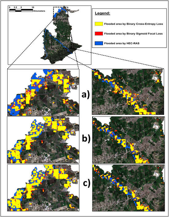 The performance of the Res–UNet and W–Res–UNet models, in particular, points to the potential of using hybrid modeling approaches that combine physical models with advanced deep-learning techniques. These models demonstrated superior flood-detection capabilities, especially when tested on unseen data, underscoring their potential for real-world applications. However, further research is needed to explore how these models can be optimized for different hydrological and geographic conditions and to address the inherent challenges in comparing image-based segmentation methods with point-based approaches.