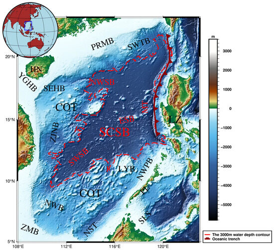 The South China Sea (SCS), one of China’s three marginal seas, is located at the intersection of the Eurasian Plate, the Philippine Sea Plate (PSP), the Pacific Plate, and the Indo-Australian Plate, making it the largest marginal sea in the western Pacific Ocean. Due to its unique geographical location, the SCS has developed landforms such as “trench–arc–backarc basin systems” and become a highly popular research area. Its topographic map is shown in Figure 1 [1]. However, precisely because the SCS is situated at the intersection of these plates, determining its origin and evolution has always been a complex challenge. Clarifying the expansion mechanism and tectonic evolution processes of the SCS will help us better understand the dynamic mechanisms of long-term tectonic complexity.