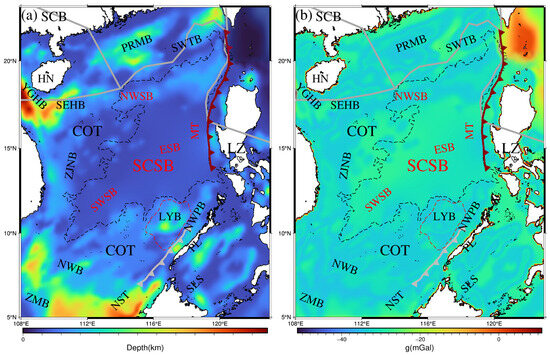 Although the tectonic evolution of the SCS has been extensively explored, numerous controversies remain, such as the expansion mechanism of the SCS and the tectonic evolution of adjacent regions like the MT and Luzon Island, which require further research to support existing models or propose new ones. Some scholars have utilized gravity inversions to obtain the Moho topography model of the SCS [13,14], thereby analyzing the crust–mantle structure of the SCS. However, the deformation mechanism of the Moho topography still requires further exploration. By combining water depth data and sediment thickness information, Li et al. [15] conducted a 3D gravity inversion in the northern SCS to derive its density anomaly model, providing a different perspective for analyzing the tectonics of the SCS. Yet, geological structures exhibit not only strong lateral heterogeneity but also complex vertical characteristics due to varying tectonic sequences and the interlaced appearance of various complex geological units. Thus, the analysis of deep-seated structures is equally essential.