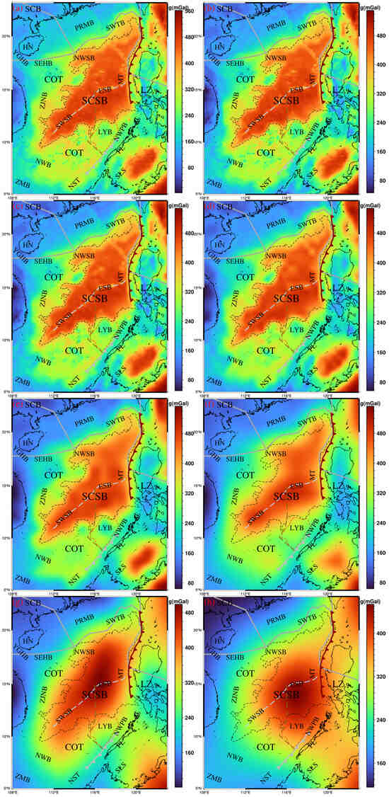 In summary, the range and volume of gravity anomaly signals increase with depth. In D3 and D4, the anomalous signals in the COT and near the MT are relatively prominent. The anomalous gravity signals in D5 mainly originate from the Moho topography undulations, and the anomalous gravity signals in the sea basin area begin to strengthen. In D6, the negative anomaly signals on the two sides of the Zhongnan–Liyue fault zone have distribution characteristics similar to the terrain. In D7 and D8, there are obvious positive gravity anomaly signals in the northeast and southwest of the SCSB, which are presumed to be related to the opening of the SCS. In D7, there are positive gravity anomaly signals in the eastern part of the SCSB, while in D8, there are prominent negative gravity anomaly signals in the south of Luzon Island. These two gravity anomaly signals are adjacent to each other and located at the plate boundary. Combined with the formation of Luzon Island, it can be inferred that the anomalous signals in these two places are related to plate subduction.