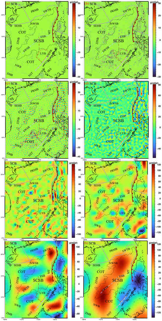 Gravity anomalies are a comprehensive reflection of internal material signals. To analyze the material from different depths, it is necessary to separate and process the gravity anomaly signals. Currently, commonly used separation methods are analytic continuation, trend analysis, wavelet separation, etc. Among them, wavelet multi-scale separation is one of the most effective methods due to its advantages such as not relying on depth-weighted functions [2]. Therefore, after sedimentary layer correction processing, this study adopted the 2D wavelet multi-scale analysis method [24] to separate the gravity anomalies in the SCS and adjacent regions, obtaining low-frequency signals and high-frequency signals of different orders, as shown in Equation (5):