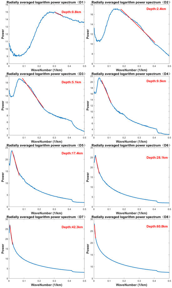 Radial logarithmic power spectrum. The blue curve is the power spectrum. The red line is used to calculate the depth by Equation (12), and the value at the top right is the calculated depth.