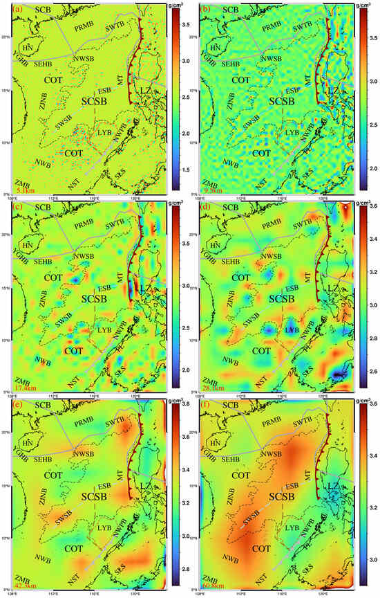 - Yu, H.; Xu, C.; Chen, H.; Chai, Y.; Qin, P.; Wang, G.; Zhang, H.; Xu, M.; Xing, C.; Wang, H. Multilayer Densities of the Crust and Upper Mantle in the South China Sea Using Gravity Multiscale Analysis. Remote Sens. 2023, 15, 3274. [Google Scholar] [CrossRef]