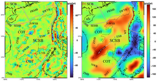 Figure 3a shows the sediment thickness in the SCS [32], while Figure 3b illustrates the sediment gravity disturbances calculated by the Parker method, which range from −40 to 0 mGal. The absolute values of gravity anomalies exhibit a characteristic pattern centered on the sea basin, gradually increasing outward, with extreme values primarily distributed in subduction zones such as oceanic trenches and troughs. According to Figure 3a, the SCS region has many sedimentary basins with varying thicknesses. The YGHB has a thickness larger than 15 km. A few basins, such as the ZMB, have sediment layers with thicknesses of 3–7 km, while most basins have sediment layers with thicknesses of 1–2 km. By deducting the gravity effect caused by sediments, we obtained the gravity anomaly without sediments (Figure 4). After eliminating the gravitational effects of sedimentary layers, the regional characteristics of the seafloor spreading ridge become more pronounced.