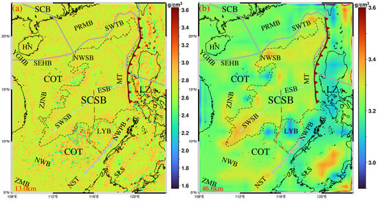 According to Figure 11, the range of the crustal density anomaly is approximately 1.6 to 3.6 g/cm3, corresponding to a depth of 13.0 km. High-density anomalies are widespread in the study area. Significant density anomalies are present in the MT and the Luzon region, as well as in the COT region. For the upper-mantle density anomaly, the range of density is approximately 2.9 to 3.6 g/cm3, corresponding to a depth of 46.6 km. The SCSB area is dominated by high-density anomalies, while the Luzon region primarily exhibits low-density anomalies. Compared to those in the crust, the density anomalies in the upper mantle are smoother. It is evident that the density variations in the shallow depth of the SCS are more pronounced in areas such as the COT and the MT, rather than in the SCSB. In contrast, the density variations in the SCSB are more significant at greater depth.