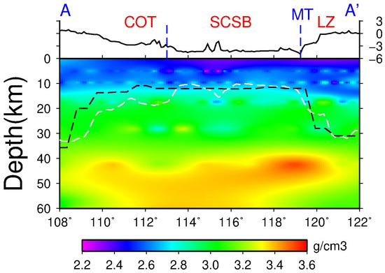 Vertical density profile. The black dashed line is the Moho interface from the CRUST1.0 model [42] and the white dashed line is the Moho interface from Li et al. [13]. The solid black line shows the topography of the profile.