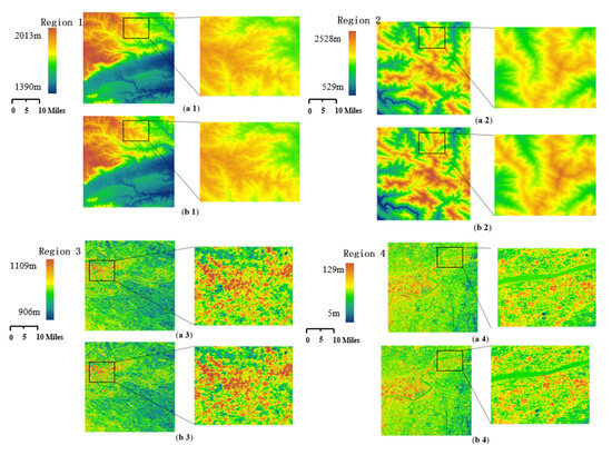 A comparison of each method for the four regions is shown in Table 3 and Figure 6, where the first column of Figure 6 is the visualization image of the primary DEM and the visualization image of the local magnified region of the primary DEMs is in the second column. The subsequent visualization reconstruction outcomes of each method in four regions correspond to each method.