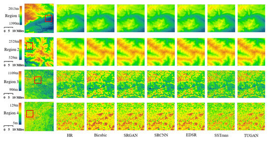 The terrain surface of Region 4 is more complex than that of Region 3, and the reconstruction quality of each method decreased. However, SSTrans and TUGAN maintained the advantages obtained on the basis of reference data, with TUGAN having a slightly higher quality than SSTrans. The MAE of TUGAN was lower than that of SSTrans, the RMSE was lower than that of SSTrans, the PSNR was higher than that of SSTrans and the SSIM was higher than that of EDSR. In regions with more complex topographic surfaces, such as Region 4, TUGAN achieved greater improvement than Region 3.