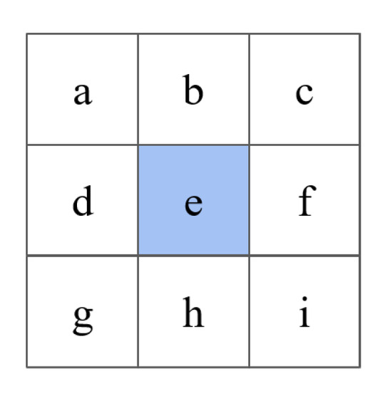 In calculating the DEM attributes at e, a nine-square scanning window is employed, with its center located at e.