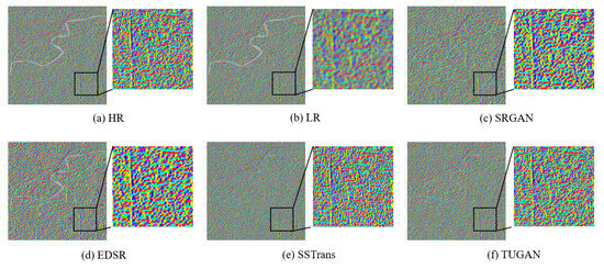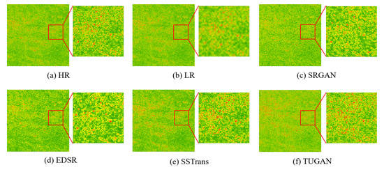 In Region 1, TUGAN’s reconstruction index is lower than SSTrans; in Region 2, TUGAN’s reconstruction index is lower than SSTrans; in Region 3, TUGAN’s reconstruction index is lower than SSTrans; in Region 4, TUGAN’s reconstruction index is lower than SSTrans. In comparison to alternative methods, the reconstruction results of TUGAN are considerably superior. The visualization results for Region 4 are shown in Figure 10. In this region, TUGAN exhibits high-quality, detailed information that is more accurate than that generated by SSTrans, SRGAN and EDSR methods.
