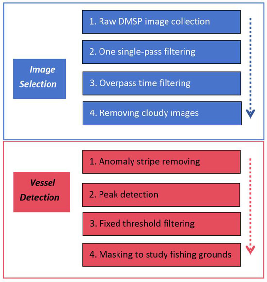Flow chart for extraction of lit fishing boats from DMSP/OLS images.