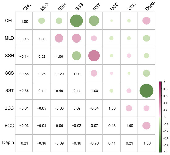 Species distribution models (SDMs) represent a powerful tool for estimating species habitat suitability through linking the distributional information of target species to environmental predictors [28]. SDMs have been successfully applied to commercially valuable fishery species [29]. In this study, we developed SDMs for lit fisheries in the Zhong Sha and Xi Sha fishing ground via the maximum entropy algorithm (MaxEnt) [30], which is a presence-only modeling approach and has been commonly applied to the marine realm [31]. In order to avoid the adverse effects of sampling bias on model fitting [32], we filtered target distribution data before modeling. To achieve this, instead of simply using all the derived fishing positions, we first kept one record per 5 arcmin grid cell only (i.e., the spatial resolution of environmental predictors) and then conducted spatial thinning and made sure that the distance between records was >20 km [33]. After data filtration, we used 140 records on average for model development (Table 2). We considered a total of eight marine predictors at a spatial resolution of 5 arcmin in our SDM analysis, including depth, SST, SSS, SSH, MLD, UCC, and VCC. These predictors are believed to influence the biology and ecology of pelagic fisheries [29]. We computed pairwise Pearson correlation coefficients (r) between the eight predictors, and the levels of all the coefficients |r| were <0.7 (Figure 3), suggesting that the eight predictors were not highly correlated [34]. Thus, all the eight predictors were included in our subsequent modeling analysis.