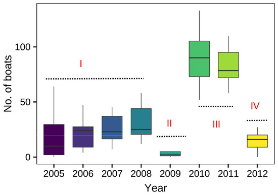 Boxplots of number of lit fishing boats derived from nighttime images of Zhong Sha and Xi Sha fishing ground. Development of lit fisheries was classified into four stages (I–IV).