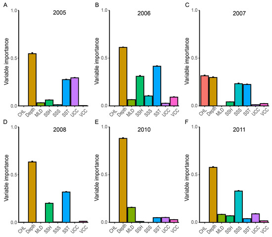 The contribution of environmental parameters to model prediction is shown in Figure 6. These results revealed that the main factors shaping the distribution of lit fisheries in the spring fishing season varied with years. Depth constantly showed a high contribution to model gains (30–88%) across years. SST also showed high importance, especially during the early stages of fishery development (2005–2008), while SSS displayed certain importance in 2006, 2007, and 2011 and SSH in 2006 and 2008.