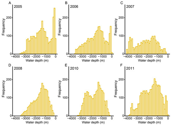 Frequency distribution of number of fishing positions against water depth for Zhong Sha and Xi Sha fishing ground, with subfigures (A–F) corresponding to the years 2005, 2006, 2007, 2008, 2010, and 2011, respectively.