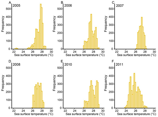 Frequency distribution of number of fishing positions against SST for Zhong Sha and Xi Sha fishing ground, with subfigures (A–F) corresponding to the years 2005, 2006, 2007, 2008, 2010, and 2011, respectively.