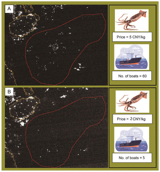 Typical nighttime imagery of fishing in the Zhong Sha and Xi Sha fishing ground in the spring season of 2008 (A) and 2009 (B).