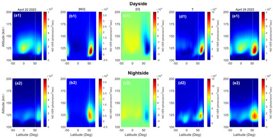 - There are differences between the simulated and observed altitude–latitude distributions of NO emissions. Simulated emission around the equator is strong compared with that at higher latitudes, especially on the dayside, during both the geomagnetic quiet period and the geomagnetic storm period. In addition, the simulated emission on the dayside is stronger than that on the nightside. This is contrary to the observations, which show weak emission around the equator. However, the altitude–latitude distribution structure of relative variation in NO emission is generally similar between simulations and observations, with enhancement peaks around 50°S/N and the peak enhancement on the nightside being generally stronger than that on the dayside.