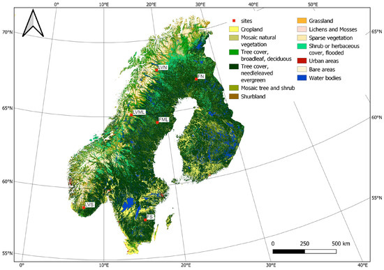 | Forest North (FN) | 66.89 | 26.02 | Tree cover, needle-leaved, evergreen |