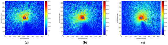 Figure 2a,b display the statistical sea clutter probability density function (PDF) and cumulative distribution function (CDF) for the whole region, near region, and far region in three data. With the increase in wave height, the sea clutter PDF shifts toward higher gray values as a whole. Furthermore, the proportion of high gray values increases, leading to a slower rate at which the CDF of sea clutter reaches 1 and a larger trailing effect. The sea clutter in the near region possesses a higher overall gray value, with larger trailing in both the PDF and CDF. Conversely, the sea clutter in the far region displays a weaker overall gray value, with smaller trailing in the PDF and CDF. Furthermore, sea clutter PDF and CDF exhibit significant differences in both near and far regions, as well as across the whole region. Hence, it is essential to process the raw data in order to achieve a consistent and homogeneous background clutter distribution.