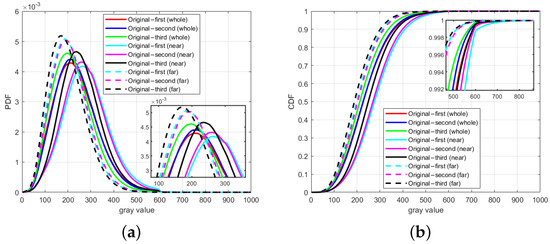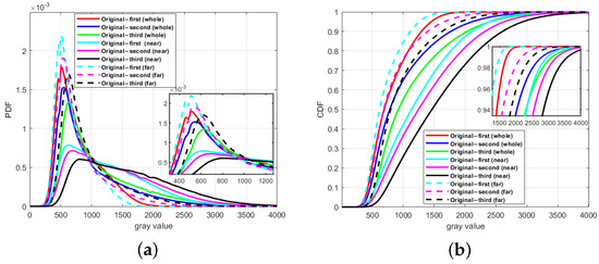 Figure 4, with each dataset further divided into three kinds to illustrate the situation in different regions. The gray value of the peaks in the PDF for far areas is approximately 190, while it reaches about 280 for near regions and around 200 for the whole area. The gray values range from 600 to 750 when the CDF reaches 1 in these three regions. The overall shape and tail of the clutter distribution remains consistent across various wave heights, and the difference in distinct regions is effectively diminished.